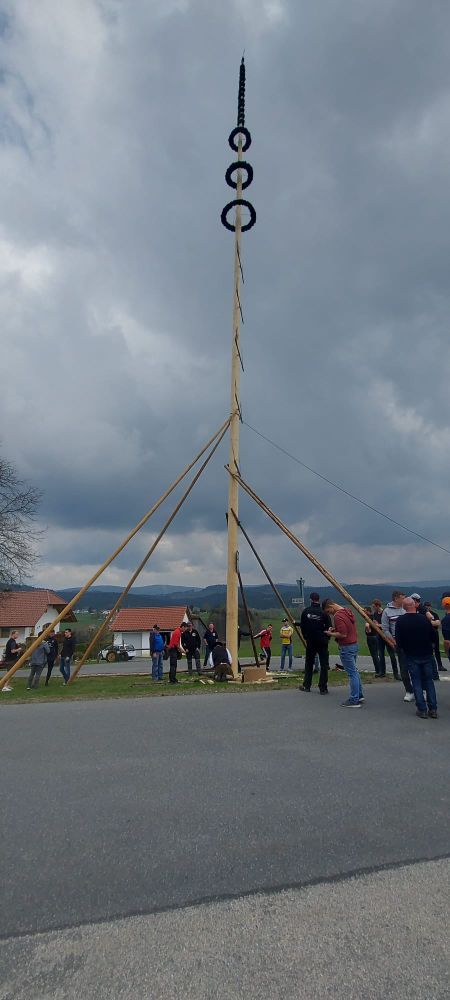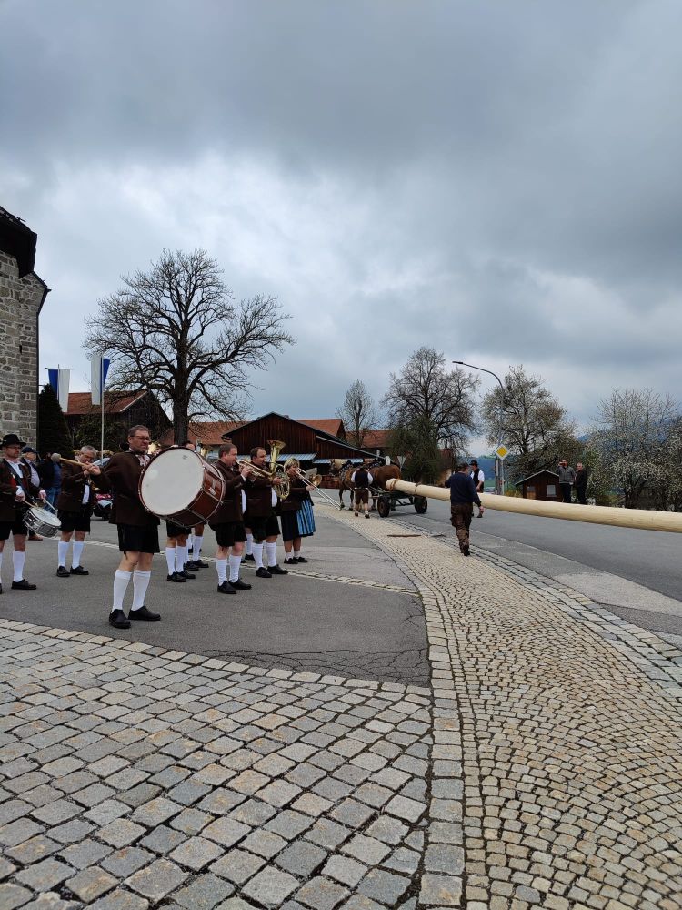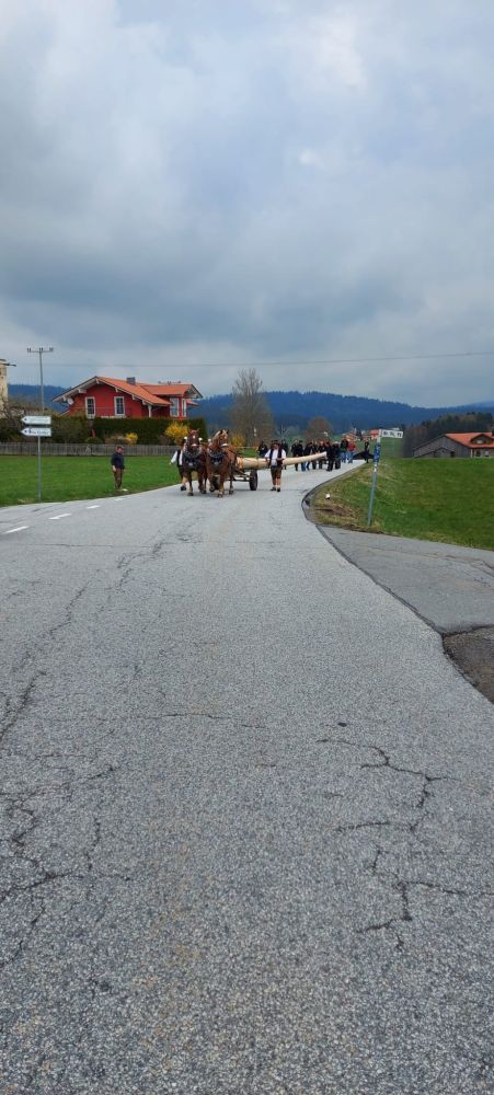 Heute war es dann soweit. Mit einem Pferdegespann und der Blaskapelle Schönbrunn am Lusen wurde der Maibaum an Ort und Stelle gebracht.